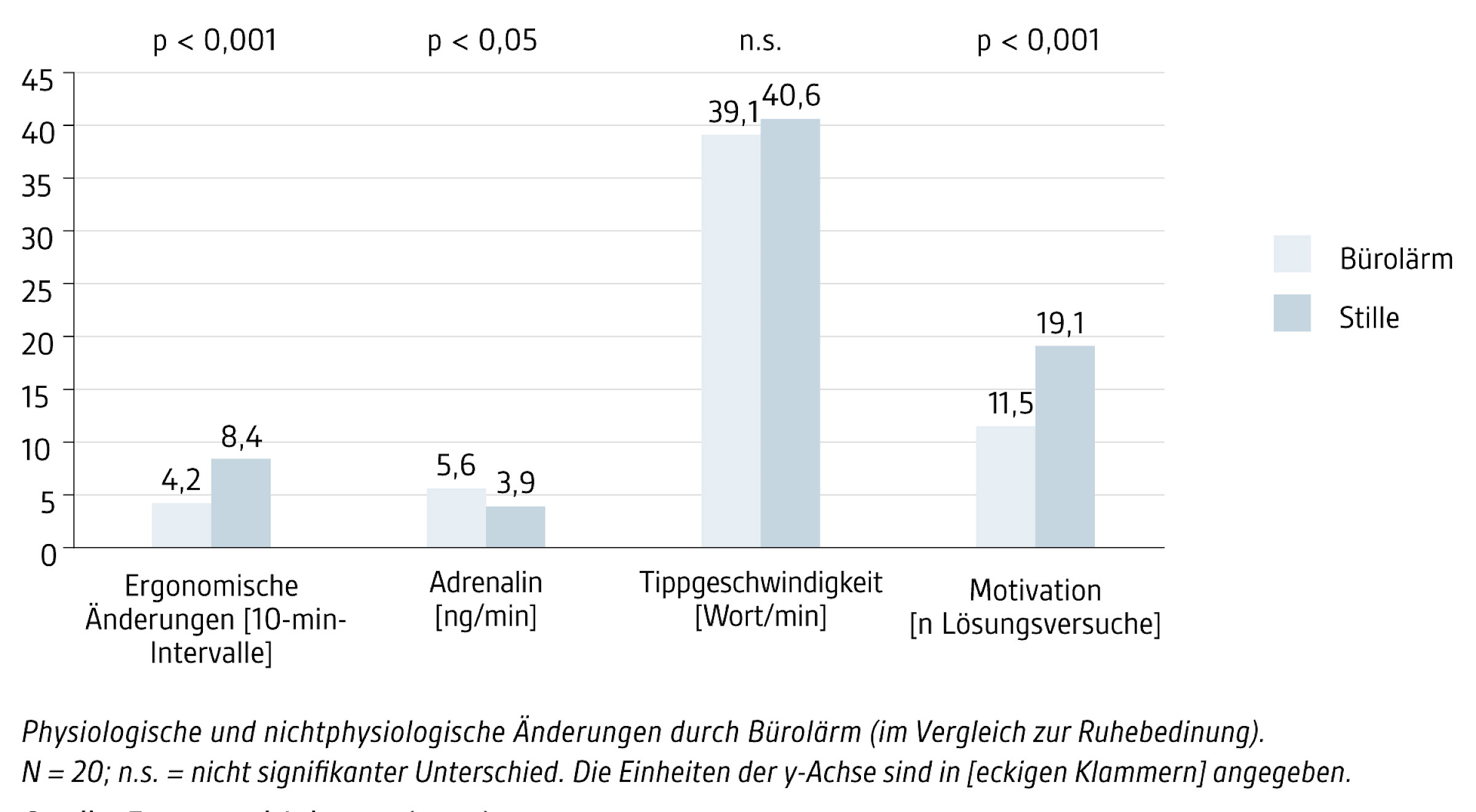 Bei 20 Teilnehmern wurde am Ende einer dreistündigen Bürositzung der Pegel der Stress- bzw. Steroidhormone Adrenalin, Noradrenalin und Cortisol im Urin gemessen. Eine Hälfte arbeitet in leiser Umgebung, die andere bei einem mittleren Lärmpegel von 55 dB(A). Die US-Forscher fanden heraus, dass ein höherer Lärmpegel den Adrenalinspiegel signifikant steigen ließ. Keine signifikante Wirkung zeigte sich bei Noradrenalin und Cortisol. Auch die Tippgeschwindigkeit, die als Indikator für die Arbeitsleistung herangezogen wurde, veränderte sich kaum. Dafür beobachteten die Forscher, dass die lautere Umgebung die Probanden geradezu erstarren ließ. Diejenigen, Teilnehmer und Teilnehmerinnen, die bei einem Lärmpegel von 55 dB(A) arbeiteten, änderten ihre Körperhaltung während der Arbeit nur halb so häufig wie die Personen in der Vergleichsgruppe. Sie verzichteten auch auf Anpassungen ihrer Stühle, Monitore und Tastaturen und nahmen damit ein höheres Risiko für Rücken- und Nackenschmerzen in Kauf.