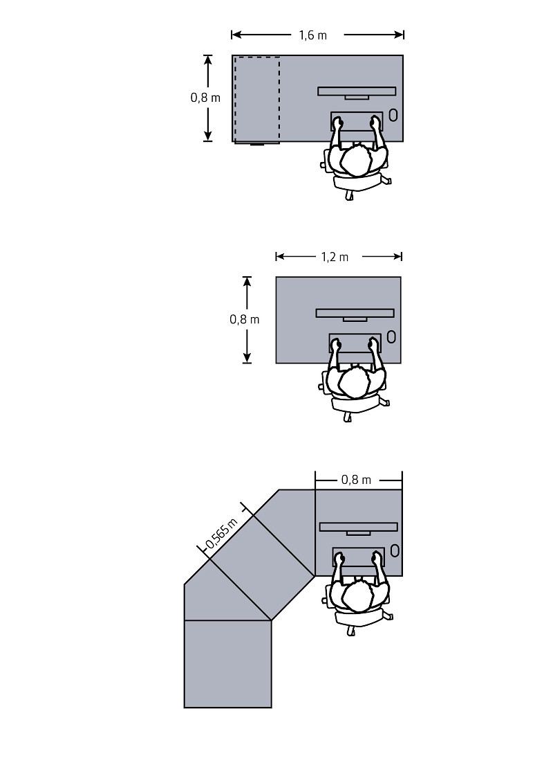- In Ausnahmefällen, wenn wenige Unterlagen benötigt werden und/oder kaum wechselnde Tätigkeiten anfallen, darf die Fläche auf ein Maß von 120 × 80 cm reduziert werden.