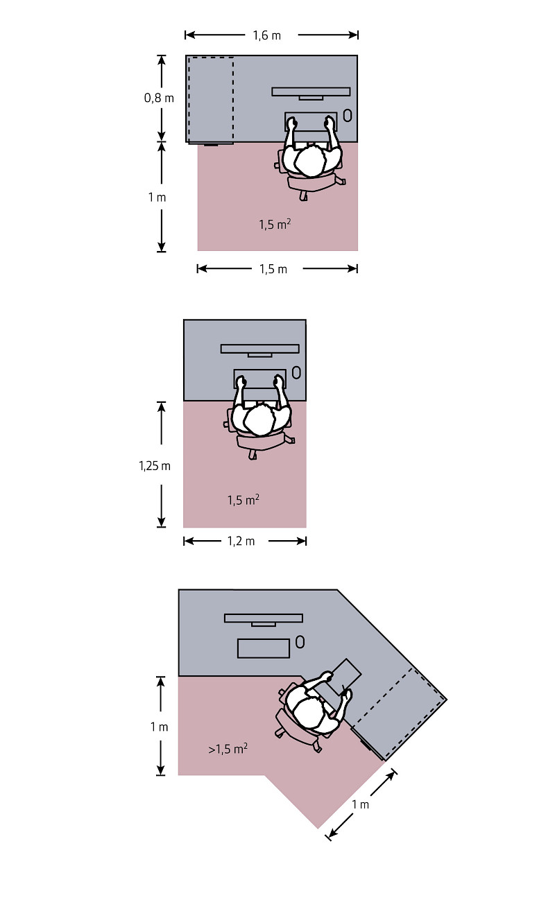 Die Bewegungsflächen an regelmäßig genutzten Arbeitsplätzen müssen mindestens 1,50 m² groß sein. (Zu den regelmäßig genutzten Arbeitsplätzen zählen auch solche, die aufgrund von Abwesenheit der Nutzer nur teilweise genutzt werden.)