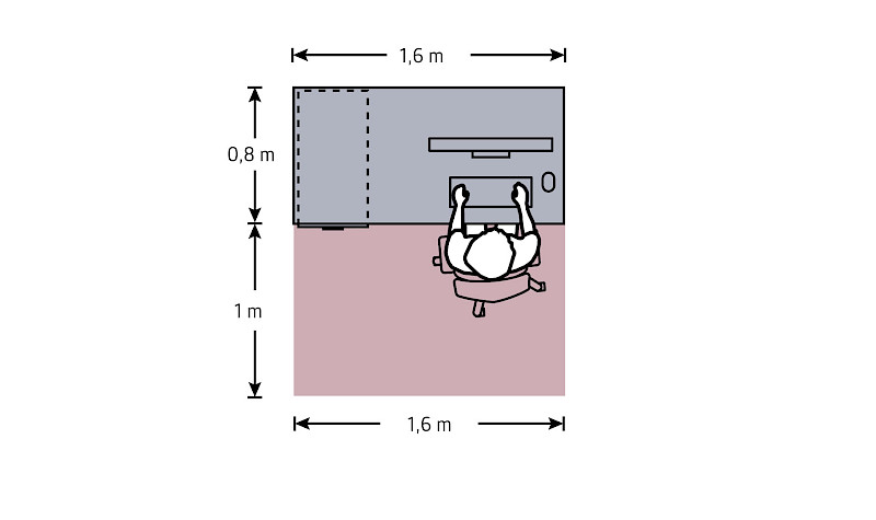 - Ausreichend groß ist die Arbeitsfläche, wenn sie mindestens 1,28 m² (z. B. 160 × 80 cm) beträgt. Die Tiefe der Arbeitsfläche muss mind. 80 cm betragen.