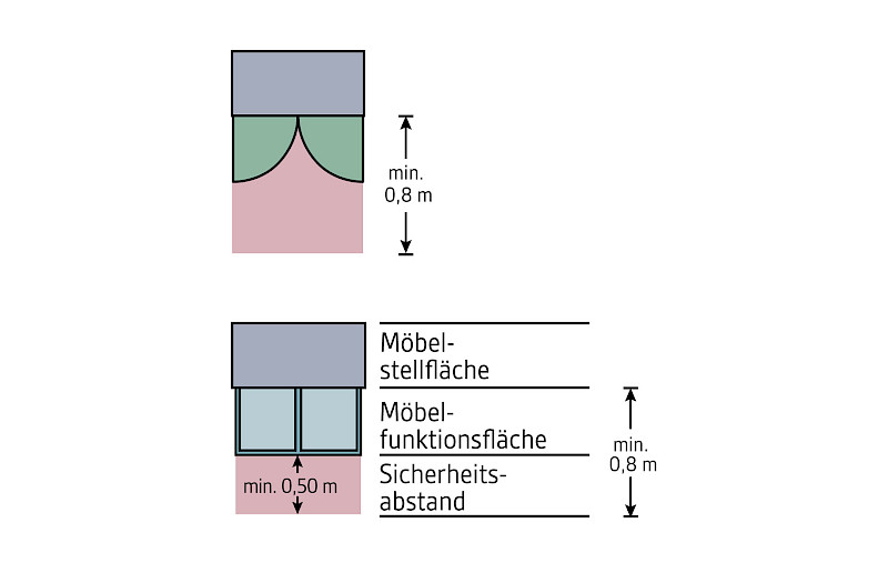 - Bei Möbeln mit Hängeregistratur: Tiefe der Funktionsfläche + 50 cm Sicherheitsabstand (mindestens jedoch 80 cm; bei einer Nutzung durch Rollstuhlfahrer sollte die erforderliche Tiefe im Rahmen einer Gefährdungsbeurteilung ermittelt werden)